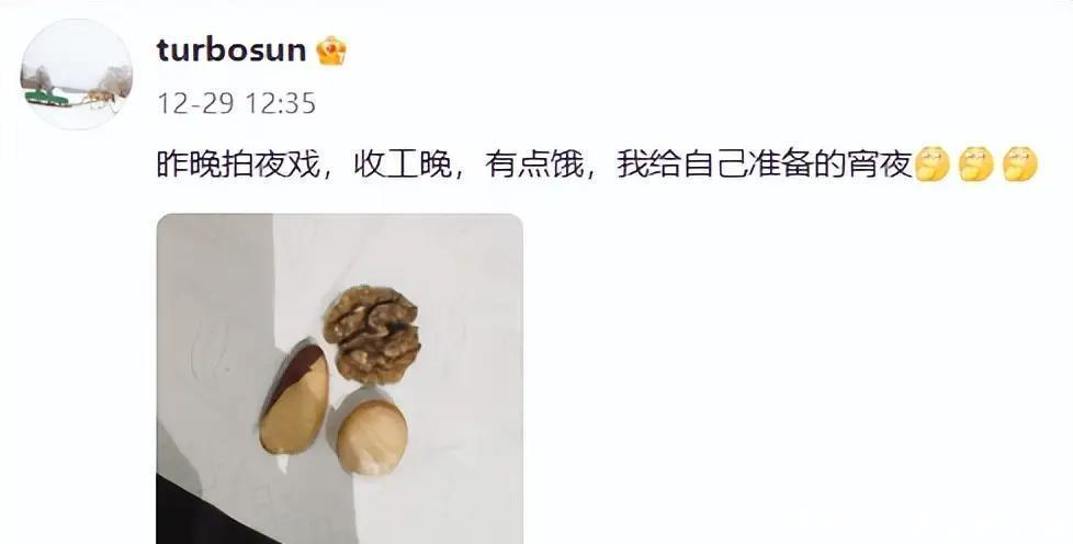 在保持身材这件事上,孙俪的自律程度让人佩服。12月29号深夜拍完戏,她发文说自己饿到发慌,最终也只吃了三颗坚果当宵夜。
