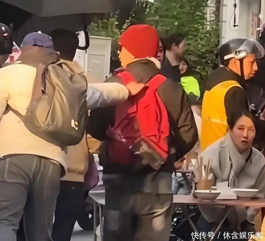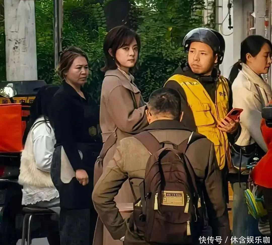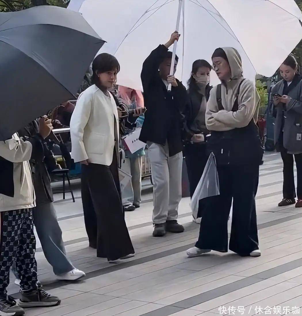 她裹着一件灰扑扑的浅棕色羽绒服,搭配一条深色长裤,站在街边和助理闲聊。虽然在人群中气质依旧出众,但脸上没什么表情,看着有些严肃。